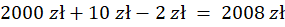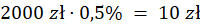 Oprocentowanie kwartalne jest równe ¼ oprocentowania rocznego, czyli 0,5%. Oblicz odsetki, jakie wypłaci bank, tzn. 0,5% z kwoty 2000 zł, a następnie oblicz podatek – 20% z kwoty odsetek. Kwota, jaką wypłacimy po kwartale będzie kwotą początkową (2000 zł) powiększoną o odsetki wypłacone przez bank (10 zł) i pomniejszoną o podatek (2 zł).