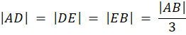 Wyznacz pola powierzchni wielokątów powstałych w wyniku podziału boku trójkąta, którego pole wynosi S, na trzy odcinki równej długości. Następnie punkty podziału przecięły dwie proste równoległe do innego boku tego trójkąta, dzieląc go na trzy figury.