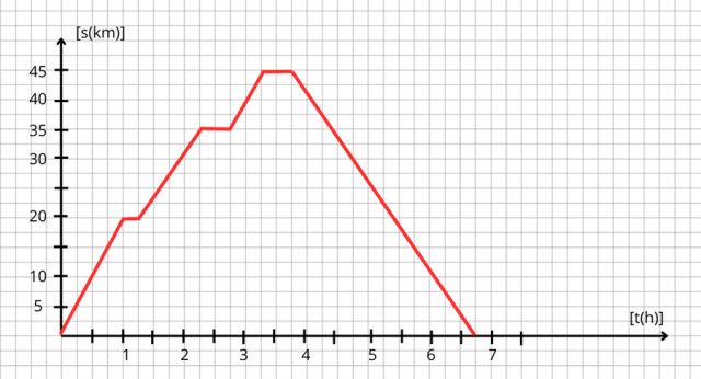 Narysuj dwie prostopadłe do siebie osie. Pionowa oś określa drogę, jaką przeszli uczestnicy wycieczki. Oś pozioma to czas, w jakim przebyli dany dystans. Trasy, w których wędrownicy poruszali się, byli w ruchu zaznaczmy jako funkcję liniową rosnącą lub malejąca w przypadku powrotu do miejsca początkowego. Przedziały czasowe, w których odpoczywali, jako funkcję stałą – nie przebyli dystansu w tym czasie.