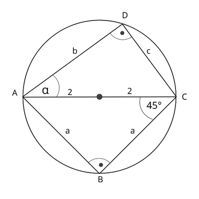 Skoro AC to średnica okręgu to trójkąty ABC i ACD są prostokątne. Obliczamy długość boku a z zależności
