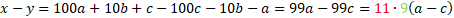 , gdzie a i c należą do przedziału <1,9> i b należy do przedziału <0,9>. Teraz zapisz różnicę tych liczb. Zauważ, że możesz wyciągnąć przed nawias liczbę 99, która jest podzielna przez 9 i 11.