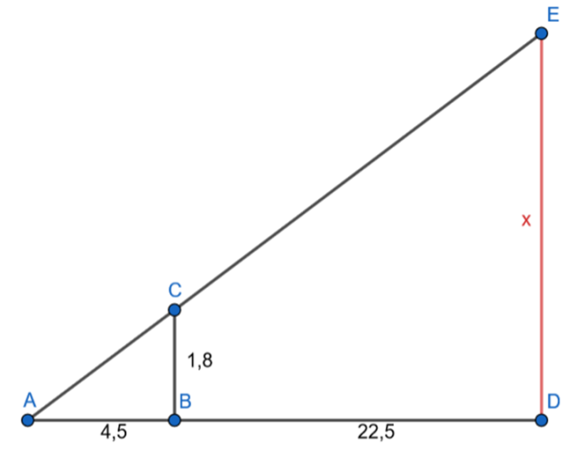 Wyznacz wysokość drzewa, jeśli uczeń o wzroście 180 cm ustawił się tak, że koniec jego cienia o długości 4,5 m pokrył się z końcem cienia drzewa oraz stanął w odległości 22,5 m od niego.