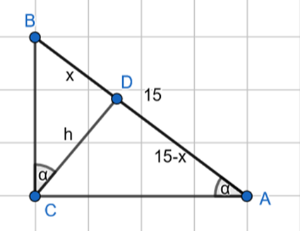 Oblicz obwód trójkąta prostokątnego ABC, którego przeciwprostokątna AB ma długość 15 cm, a wysokość CD, podzieliła go na dwa trójkąty ADC i BCD, których stosunek pól jest równy 4.
