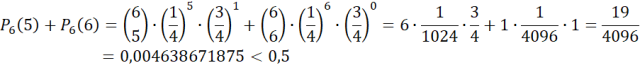 Ustal, czy szansa zaliczenia testu jest większa od 0,5%, jeśli pewien test składa się z sześciu pytań, dla każdego pytania podane są cztery odpowiedzi, z których tylko jedna jest poprawna, a aby zaliczyć test należy dobrze odpowiedzieć na co najmniej pięć pytań.