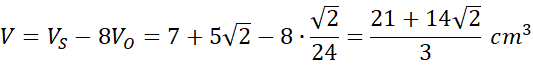 Następnie ze wzoru na objętość oblicz objętość całego sześcianie i odciętego ostrosłupa, a następnie oblicz objętość całej figury odejmując od objętości sześcianie ośmiu odciętych ostrosłupów.