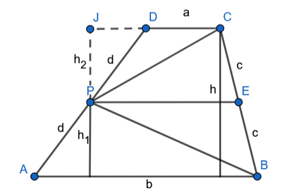 Wykaż, że pole trójkąta BPC jest dwa razy mniejsze od pola trapezu ABCD, jeśli dany jest trapez ABCD, a punkt P jest środkiem ramienia AD.