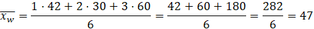 Wskaż odpowiedź, w której podano liczbę punktów, jaką uzyskała Ania za cały egzamin. Dostała 42 punkty z pierwszej części z wagą 1, 30 punktów z drugiej części z wagą 2 oraz 60 punktów z trzeciej części z wagą 3, a wynik to średnia ważona uzyskanych punktów.