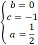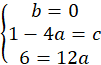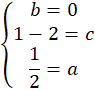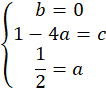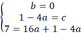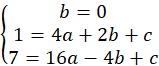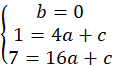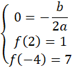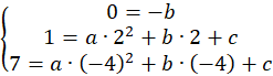 Stwórz układ równań. Pierwsze równanie: skoro wierzchołek funkcji leży na osi y, to pierwsze współrzędna tego wierzchołka to 0. Drugie równanie: wykorzystaj fakt, że punkt A należy do paraboli i zapisz równość f(2) = 1. Trzecie równanie: wykorzystaj fakt, że punkt B należy do paraboli i zapisz równość f(-4) = 7. Wyznacz wartości współczynników a, b i c i następnie równanie paraboli.