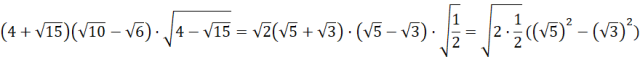 . Przy tym pierwszym wymnóż nawiasy i zredukuj wyrazy podobne. Przy drugim musisz zauważyć, że wyrażenie pod pierwiastkiem jest wynikiem podniesienia wyrażenia