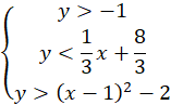 Na rysunkach przedstawiono fragmenty paraboli lub prostych. Musisz opisać za pomocą układu nierówności zbiór, który jest zaznaczony kolorem.