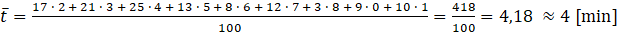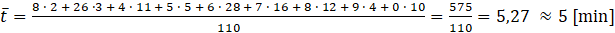 Dane z tabelki przedstawiasz na wykresie tak, aby można było odczytać liczbę rozmów trwających określony okres czasu. Średni czas rozmów to średnia arytmetyczna wyników.