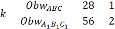 Znając obwody obu trójkątów podobnych, można obliczyć stosunek podobieństwa: