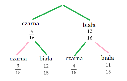 Wskaż, jakie jest prawdopodobieństwo wylosowania kul różnego koloru, jeśli losujemy z urny, w której znajdują się 4 czarne kule i 12 białych.