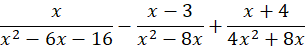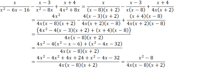 Sprowadź ułamki do wspólnego mianownika i na jedną kreskę ułamkową. Maksymalnie uprość licznik. Wyznacz dziedzinę, wiedząc, że mianownik musi być różny od zera.