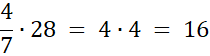 Obliczając ułamek z jakiejś liczby, należy pomnożyć go przez tę liczbę. Pamiętaj o upraszczaniu. Tutaj możesz skrócić 7 i 28: