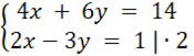 Rozwiązujemy równanie metodą przeciwnych współczynników. Ta metoda polega na dodawaniu równań stronami, w sytuacji gdy przy tej samej niewiadomej w dwóch równaniach mamy przeciwne współczynniki. Dzięki czemu po zsumowaniu równań zanika jedna niewiadoma. Otrzymujemy wtedy równanie z jedną niewiadomą.