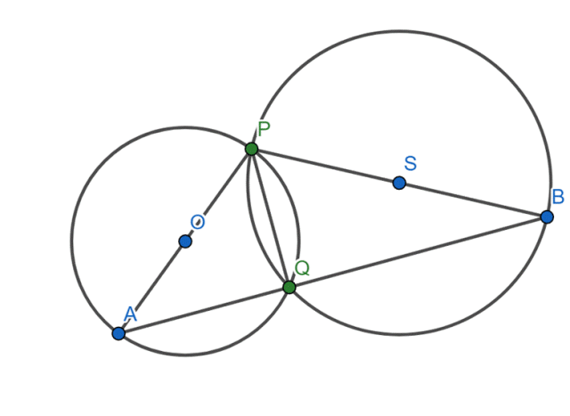 Dwa okręgi przecinają się w punktach P i Q. Poprowadzono średnicę PA w pierwszym okręgu oraz średnicę PB w drugim okręgu. W tym zadaniu musisz wykazać, że punkty A, Q, B są współliniowe.