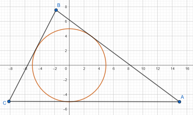 Oblicz wierzchołki i tego trójkąta, jeśli wiadomo, że jego przeciwprostokątna jest równoległa do osi , jeśli punkt jest wierzchołkiem trójkąta prostokątnego o kącie prostym przy wierzchołku , opisanego na okręgu .