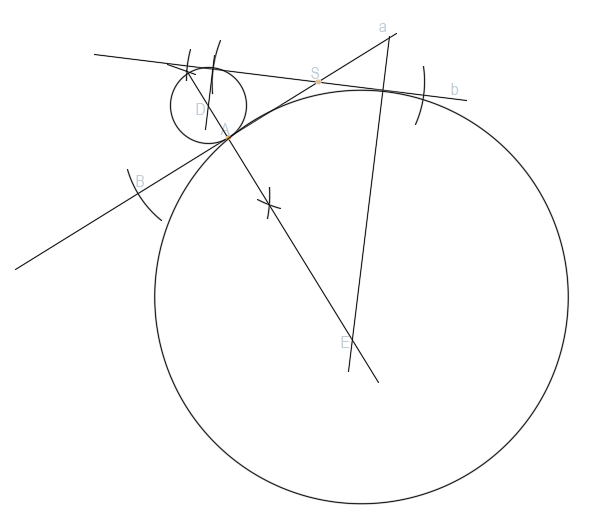 Skonstruuj okrąg styczny do dwóch przecinających się prostych w takich sposób, aby punkt na jednej z prostych był puntem styczności prostej z okręgiem.