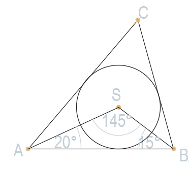 Podaj miary trójkąta ABC, jeśli jest on opisany na okręgu o środku w punkcie S a trójkąt ABD ma miary 20°, 15°, 145°.