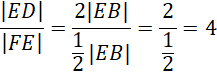 Trapezy równoramienne ABEF i BCDE są figurami podobnymi. Pole trapezu BCDE jest czterokrotnie większe niż pole trapezu ABEF. Oblicz stosunek długości odcinka ED do długości odcinka FE.