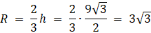 Bok trójkąta wynosi 9. Promieni okręgów odpowiednio wpisanego i opisanego oznacz jako r i R. Wiesz, że: