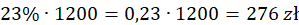 VAT stanowi 23% ceny netto. Wylicz, ile wynosi 23% z 1200 zł, aby to zrobić, pomnóż 23% przez 1200 zł (liczbę procentów możesz zapisać w postaci ułamka, tak żeby w mianowniku było 100, a w liczniku liczba procentów).