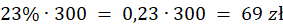 Wylicz, ile wynosi 23% z 300 zł, aby to zrobić, pomnóż 23% przez 300 zł (liczbę procentów możesz zapisać w postaci ułamka, tak żeby w mianowniku było 100, a w liczniku liczba procentów).
