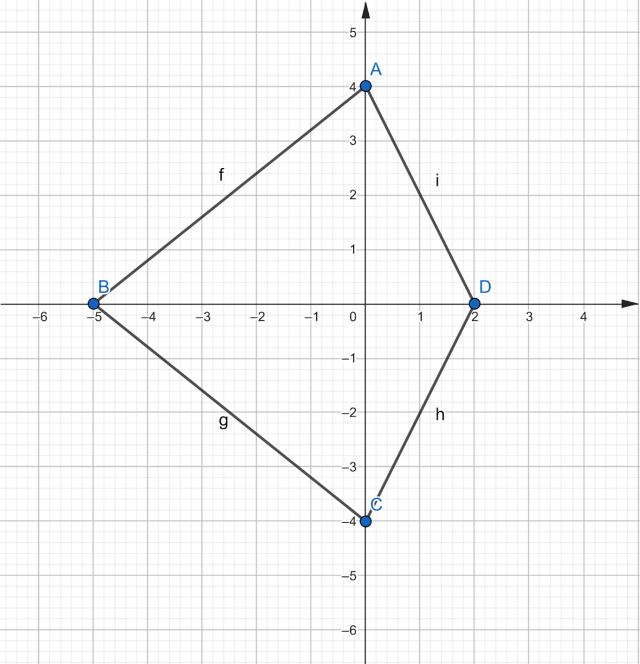 Kreator zabawek chciał stworzyć nowy rodzaj latawca, którego szkieletem miały być dwie listewki. W układzie współrzędnych zaprojektował on jego model. Punkty A(0,4), B(-5,0) C(0,-4) i D(2,0) oznaczają końce listewek. Zaznacz te punkty w układzie współrzędnych i nazwij wielokąt, którego kształt ma latawiec.