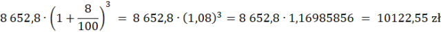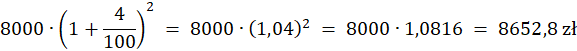 Musisz rozdzielić dwa okresy, w ciągu których pieniądze były na lokacie. Na początku do wzoru podstaw wartości z pierwszego okresu, czyli czas 2 lat i oprocentowanie 4%. Następnie do wzoru podstaw kolejne wartości, jako kwotę – ilość – pieniędzy uzyskaną po 2 latach trzymania pieniędzy na lokacie, jako czas - 3 lata i jako oprocentowanie 8%.