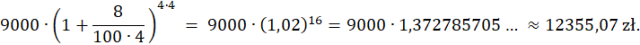 Właściciel salonu fryzjerskiego musi mieć 12 000 zł, aby wyremontować lokal. Cztery lata temu wpłacił on do banku 9000 zł na lokatę, która była oprocentowana na 8% w skali roku z kwartalną kapitalizacją odsetek. Czy kwota z lokaty wystarczy na remont?