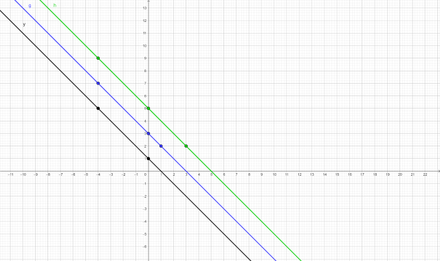 Projekt logo, który został zamówiony przez właściciela restauracji, miał zawierać trzy proste równoległe. Grafik umieścił je w układzie współrzędnych. Pierwsza z nich ma wzór y = -x +1, a o pozostałych wiesz, że do jednej należy punkt (1, 2), a do drugiej punkt (3, 2). Narysuj te wszystkie trzy proste.