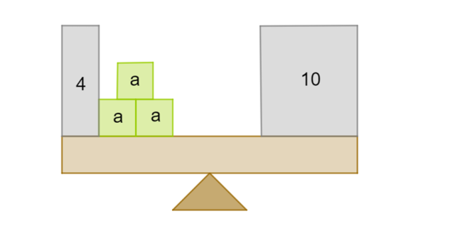Obie strony wagi są w równowadze, czyli masy przedmiotów tam umieszczonych są takie same. Na jednej stronie umieść ciężarek o masie 4 i trzy pakunki ważące a każdy, a po drugiej stronie musi znaleźć się odważnik o masie 10.
