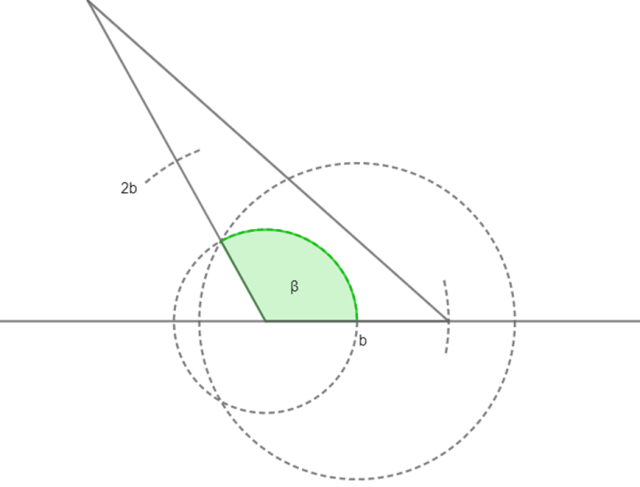 Narysuj prostą, a na niej zaznacz punkt. Teraz odmierz długość odcinka b i zatocz taki luk o środku we wcześniej wybranym miejscu, otrzymasz bok długości b. Następnie zatocz w punkcie łuk o promieniu taki, jak w kącie beta. Potem odmierz cyrklem odległość między ramionami (zmierz dystans pomiędzy końcami narysowanego łuku) i taki sam łuk przenieś na swój rysunek (wbij cyrkiel w miejsce przecięcia się poprzedniego łuku i prostej). Miejsce przecięcia się łuków to miejsce, przez które przebiega drugie ramię kąta. Narysuj je stosunkowo długie, a następnie ponownie odmierz długość odcinka b, przyłóż cyrkiel do wierzchołka kąta, odmierz tę długość i w miejscu przecięcia się półprostej i tego łuku, znowu odmierz odcinek b, aby bok trójkąta miał długość 2b. Teraz połącz ze sobą końce boków trójkąta, tworząc tym samym jego trzeci bok.