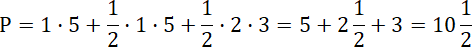 Pole wielokąta możesz zapisać na różne sposoby, np. jako sumę pola trójkąta prostokątnego o przyprostokątnych długości 2 i 3 kratki i trapezu o podstawach długości 1 i 2 kratki oraz wysokości równej 5 kratek, różnicę pola dużego kwadratu o boku długości 5 i trójkąta prostokątnego o przyprostokątnych długości 1 i 5 kratek oraz trapezu o podstawach 3 i 5 kratek i wysokości wynoszącej 3 kratki itd. Kiedy dzielisz pole na mniejsze fragmenty, dodawaj je do siebie, a gdy wypisujesz pole wielokąta większego od podanej figury – odejmij od pola wielokąta pola części, które nie należą do twojej figury.
