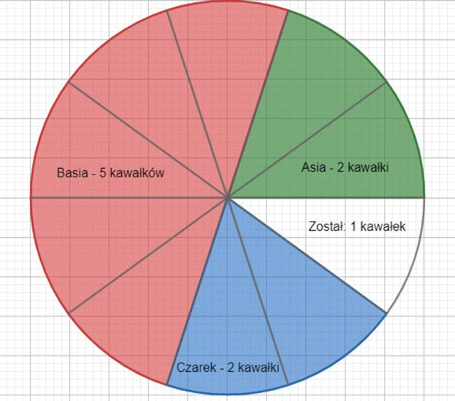 Czarek zjadł: 10 – 2 – 5 – 1 = 10 – 8 = 2 kawałki, czyli