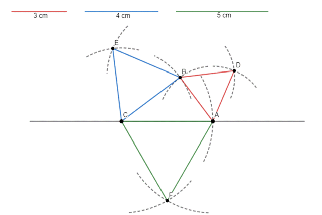 Na początek narysuj odcinki o długości 3 cm, 4 cm oraz 5 cm, będą one potrzebne do odmierzania odległości za pomocą cyrkla. Następnie narysuj prostą i zaznacz na niej punkt. Od niego zatocz łuk o promieniu jednego z narysowanych odcinków. Na każdym końcu nowo otrzymanego boku zatocz łuki o promieniach długości pozostałych dwóch odcinków, miejsce przecięcia się tych łuków to miejsce trzeciego wierzchołka, połącz go z podstawą. Teraz podpisz odpowiednio wierzchołki trójkąta: odczytaj z treści, jak nazywają się poszczególne boki i zapisz te litery przy punktach. Na koniec przy każdym boku zatocz dwa łuki takiej samej długości co bok, by otrzymać trójkąt równoboczny o takich wymiarach (trójkąty muszą znaleźć się na zewnątrz trójkąta prostokątnego). Podpisz nowo otrzymane punkty w miejscach przecięć się łuków.