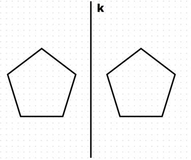 Pięciokąty są symetryczne, jeśli leżą w tej samej odległości względem prostej k. Aby skonstruować dwa pięciokąty symetryczne względem prostej, najpierw narysuj jeden pięciokąt po jednej stronie prostej, a następnie zmierz odległość jego wierzchołków od prostej, i zaznacz punkt oddalone o tę samą odległość z drugiej strony prostej. Zaznaczone punkty są wierzchołkami symetrycznego pięciokąta.