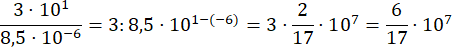 Podziel liczby zapisane w notacji wykładniczej: podziel pierwszy czynnik z jednej liczy przez pierwszy czynnik drugiej liczby. To samo zrób z drugimi czynnikami liczb – pamiętaj, że dzieląc potęgi o tych samych podstawach, musisz odjąć od siebie wykładniki, a podstawy pozostają bez zmian. Wynik zapisz w postaci notacji wykładniczej.