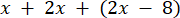 Kuba jest pewną liczbą lat, którą oznaczamy symbolem x. Zosia jest starsza od Kuby o dwa razy, czyli jej wiek możemy zapisać jako 2x. Brat Artur jest o 8 lat młodszy od Zosi, więc jego wiek można zapisać jako (2x - 8). Zapisz sumę tych wyrażeń i uprość ją.