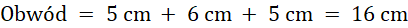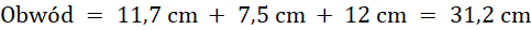Obwód trójkąta obliczasz, sumując długości boków trójkąta. Pole obliczasz, podstawiając długość podstawy trójkąta i wysokość padającą na tę podstawę, do wzoru na pole trójkąta.