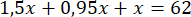 Odpowiedź: D. 1,15x + 0,95x + x = 62