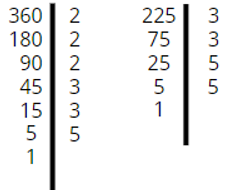 W rozkładach obu liczb występują jednocześnie liczby: 3, 3, 5, stąd NWD(360, 225) = 3 ∙ 3 ∙ 5 = 45
