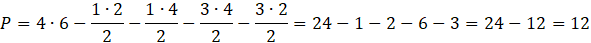 Pole czworokąta to różnica pola prostokąta i powstałych czterech trójkątów.