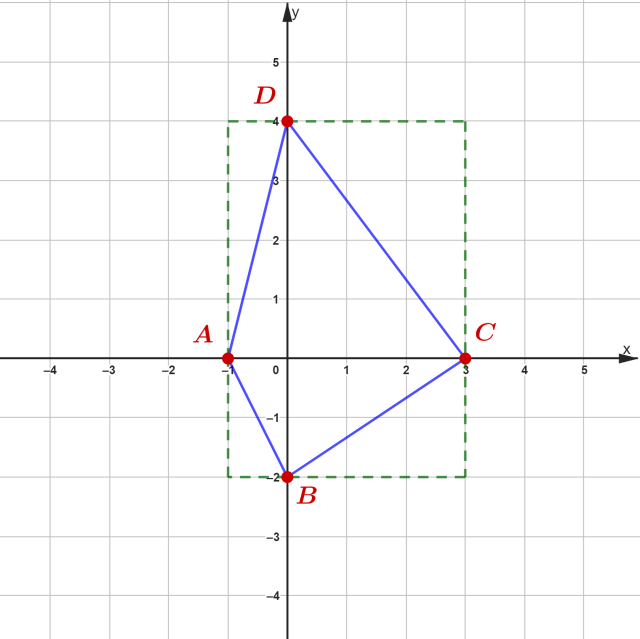 W tym zadaniu musisz obliczyć pole czworokąta o wierzchołkach A = (-1,0), B = (0,-2), C = (3,0), D = ( 0,4).