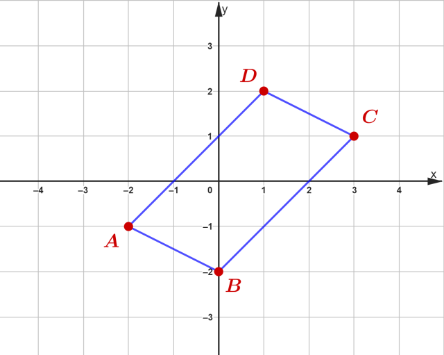W tym zadaniu musisz podać współrzędną wierzchołka D równoległoboku ABCD, skoro A = (-2,-1), B = (0,-2), C = (3,1).