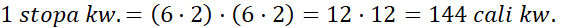 Podobnie jak liczymy jednostki kwadratowe, takie również możemy zamieniać. Wystarczy obliczyć pole kwadratu o boku 1 stopa w calach.