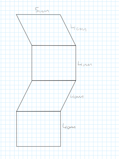 Narysuj opisaną siatkę. Pamiętaj, że nie wszystkie kąty w graniastosłupie pochyłym mają miarę 90°. Zaznacz na rysunku długości boków takie, jakie posiada graniastosłup.