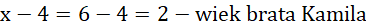 Obecny wiek Kamila oznaczasz jako x. Brat jest od Kamila o 4 lata młodszy, więc możesz zapisać jego wiek jako