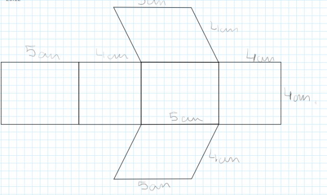Narysuj opisaną siatkę. Pamiętaj, że nie wszystkie kąty w graniastosłupie pochyłym mają miarę 90°. Zaznacz na rysunku długości boków takie, jakie posiada graniastosłup. Pamiętaj o tym, że pole boczne składa się z prostokątów, a podstawy są dwie.